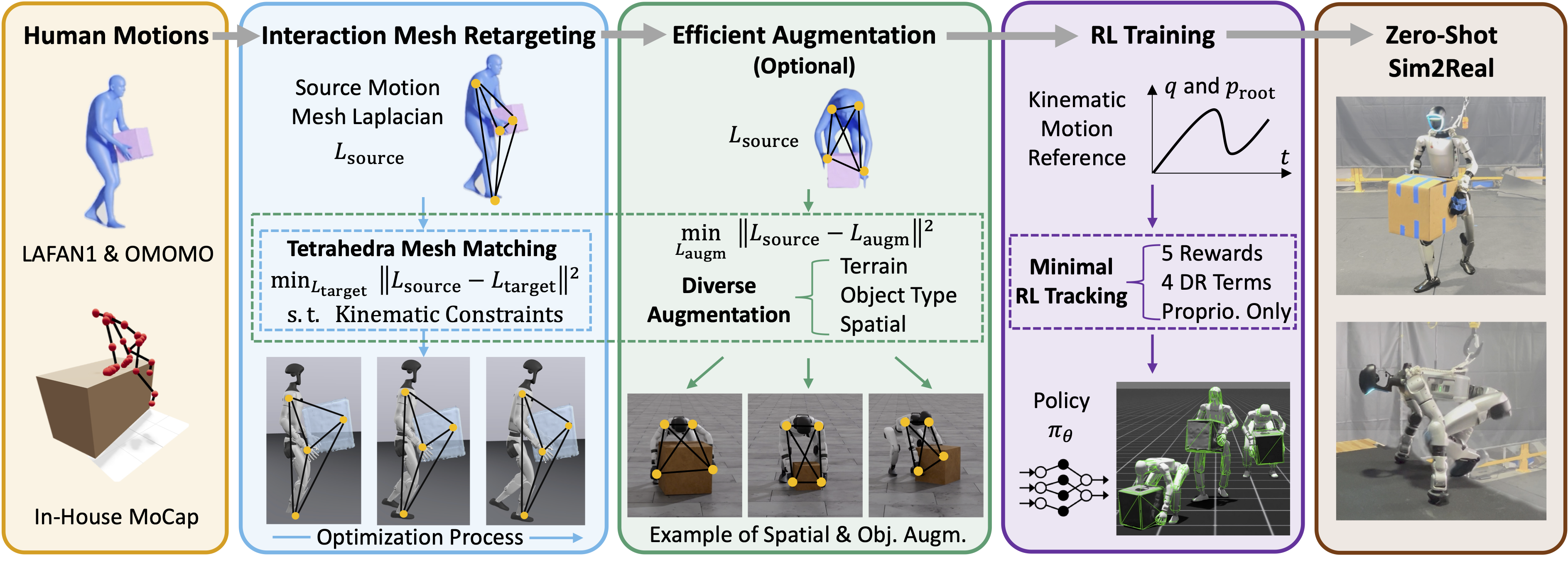 A dominant paradigm for teaching humanoid robots complex skills is to retarget human motions as kinematic references to train reinforcement learning (RL) policies. However, existing retargeting pipelines often struggle with the significant embodiment gap between humans and robots, producing physically implausible artifacts like foot-skating and penetration. More importantly, common retargeting methods neglect the rich human-object and human-environment interactions essential for expressive locomotion and loco-manipulation. To address this, we introduce OmniRetarget, an interaction- preserving data generation engine based on an interaction mesh that explicitly models and preserves the crucial spatial and contact relationships between an agent, the terrain, and manipulated objects. By minimizing the Laplacian deformation between the human and robot meshes while enforcing kinematic constraints, OmniRetarget generates kinematically feasible trajectories. Moreover, preserving task-relevant interactions enables efficient data augmentation, from a single demonstration to different robot embodiments, terrains, and object configurations. We comprehensively evaluate OmniRetarget by retargeting motions from OMOMO, LAFAN1, and our in-house MoCap datasets, generating over 9-hour trajectories that achieve better kinematic constraint satisfaction and contact preservation than widely used baselines. Such high-quality data enables proprioceptive RL policies to successfully execute long- horizon (up to 30 seconds) parkour and loco-manipulation skills on a Unitree G1 humanoid, trained with only 5 reward terms and simple domain randomization shared by all tasks, without any learning curriculum.
